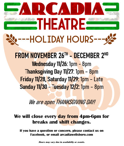 The Arcadia Theatre, located on Main Street in Wellsboro, PA is a classic downtown movie house that opened in 1921. In 1997, the theatre was transformed into a 4 screen theatre, which shows the latest films at the best prices. In 2021, we reached the century mark and celebrated our 100th anniversary of entertaining Wellsboro and Tioga County.